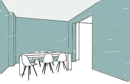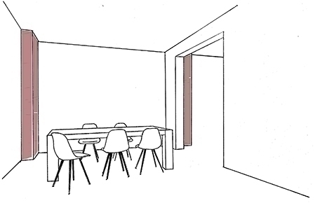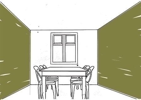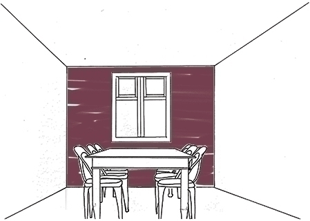 Een eenvoudige methode om de ruimte minder diep te laten lijken, is door één muur in een donkere kleur te schilderen dan de rest van de muren, het plafond en de vloer. Door één muur in een donkere kleur te schilderen lijkt het net of de muur dichter naar je toe komt.